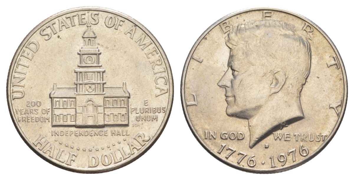 США 1/2 доллара (50 центов) 1976 D, 200 лет независимости, Джон Кеннеди KM 205 медь плакированная медно-никелем aUNC 4565-346