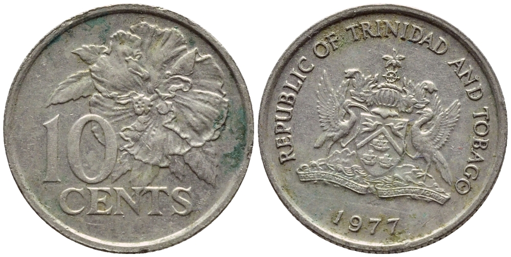 Тринидад и Тобаго 10 центов 1977 цветок гибискуса KM 31 медно-никель 4396-857