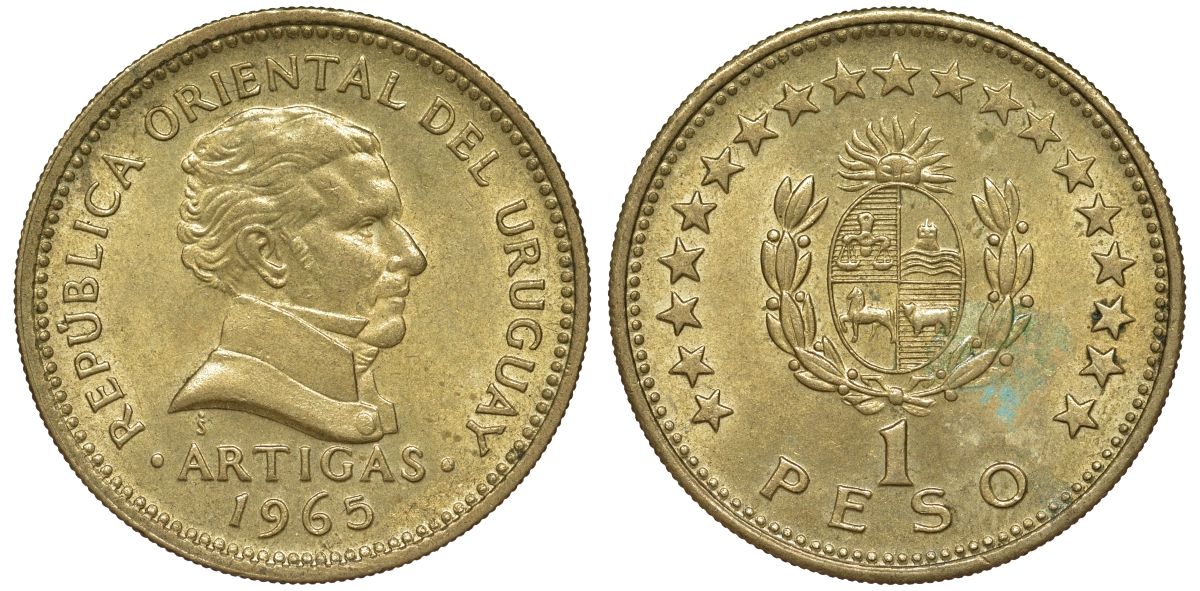 Уругвай 1 песо 1965 KM 46 алюминиевая бронза 33-315
