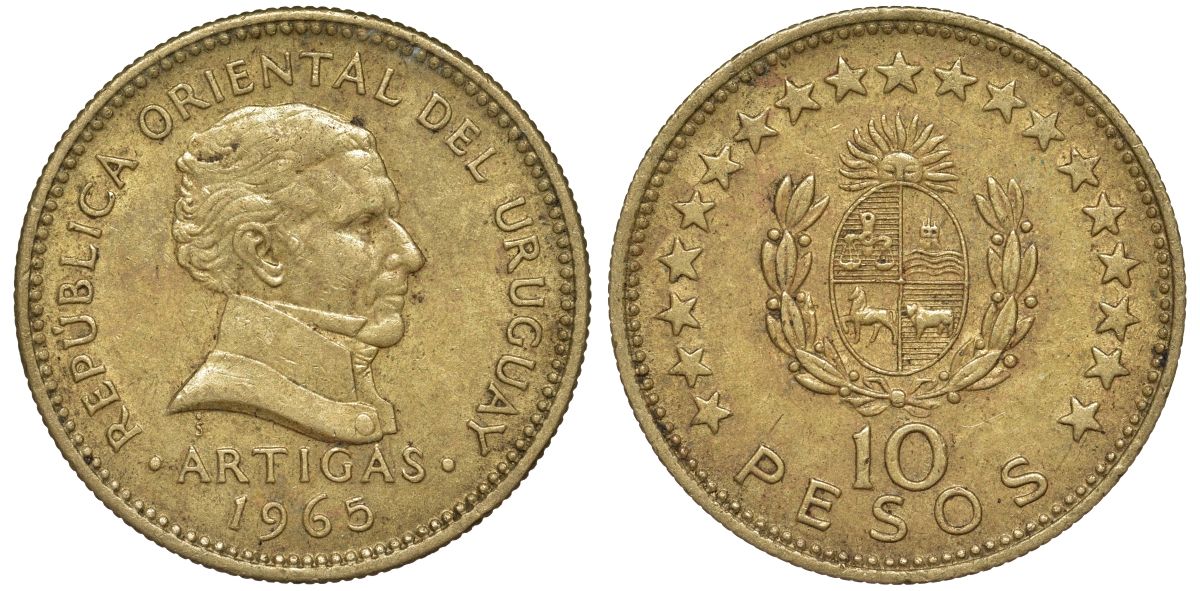 Уругвай 10 песо 1965 KM 48 алюминиевая бронза 69-743