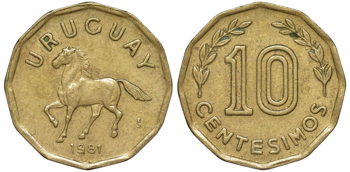 Уругвай 10 сентесимо 1981 KM 66 алюминиевая бронза 4169-522