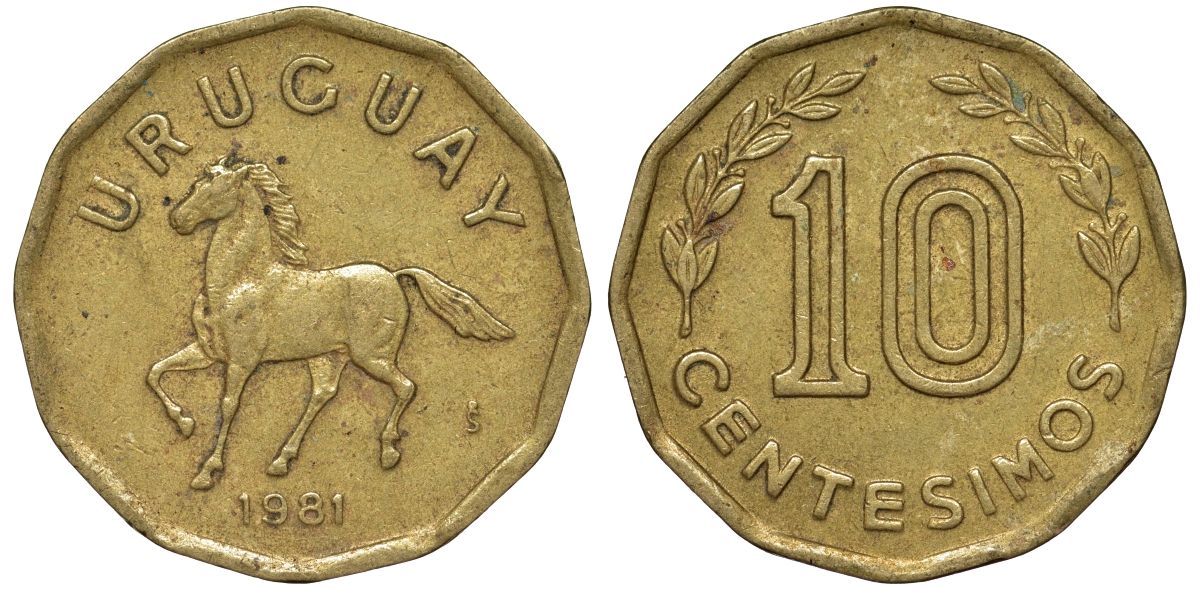 Уругвай 10 сентесимо 1981 KM 66 алюминиевая бронза 4169-541