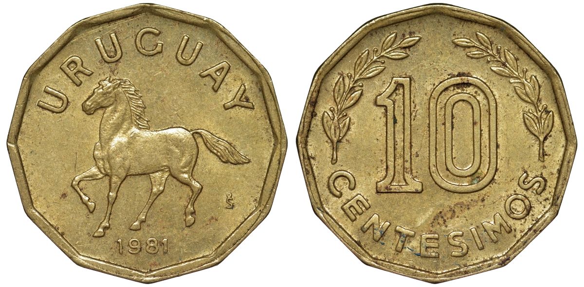 Уругвай 10 сентесимо 1981 KM 66 алюминиевая бронза 4169-542