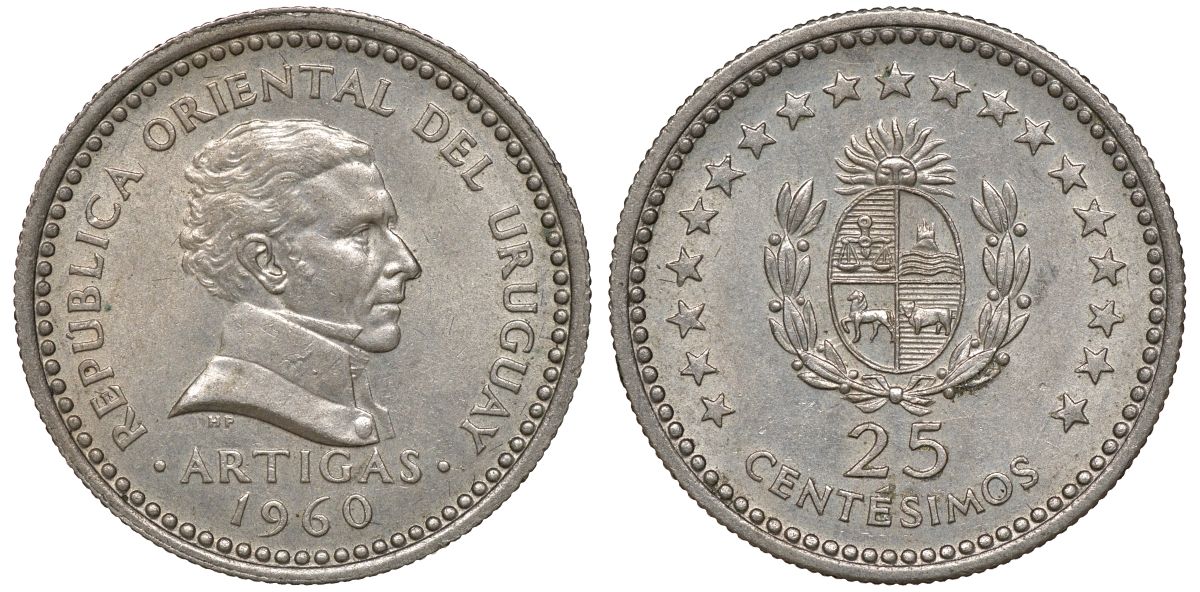 Уругвай 25 сентесимо 1960 KM 40 медно-никель 4169-859