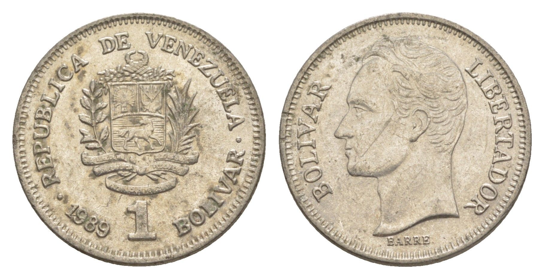 Венесуэла 1 боливар 1989 Симон Боливар, тонкий шрифт Y 52a.1 сталь плакированная никелем 4591-117