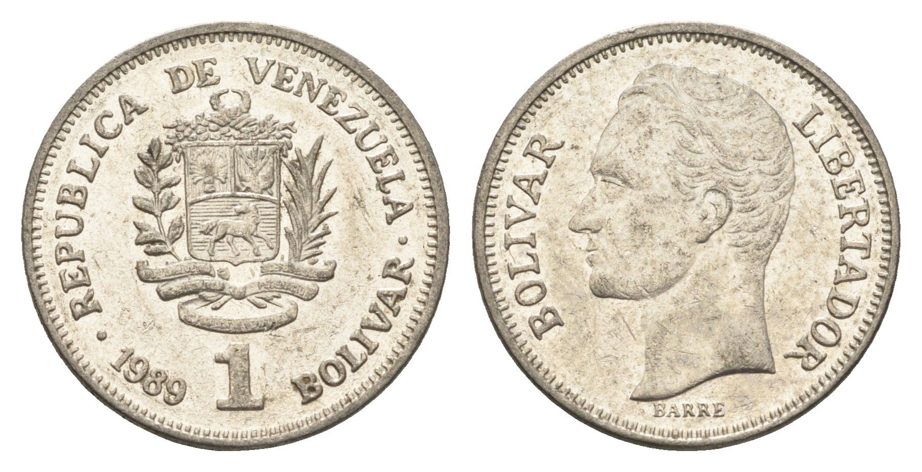 Венесуэла 1 боливар 1989 Симон Боливар, тонкий шрифт Y 52a.1 сталь плакированная никелем 4662-844