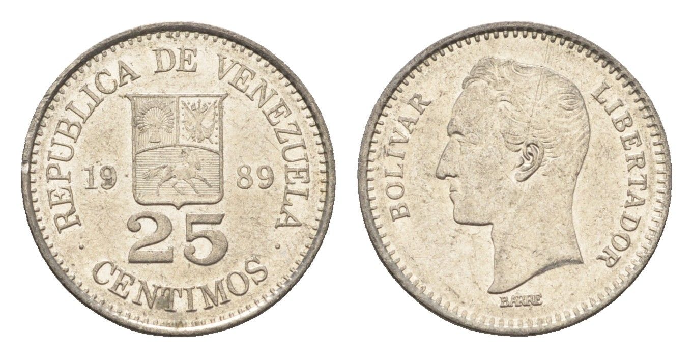 Венесуэла 25 сентимо 1989 Симон Боливар Y 50a сталь плакированная никелем 4664-222