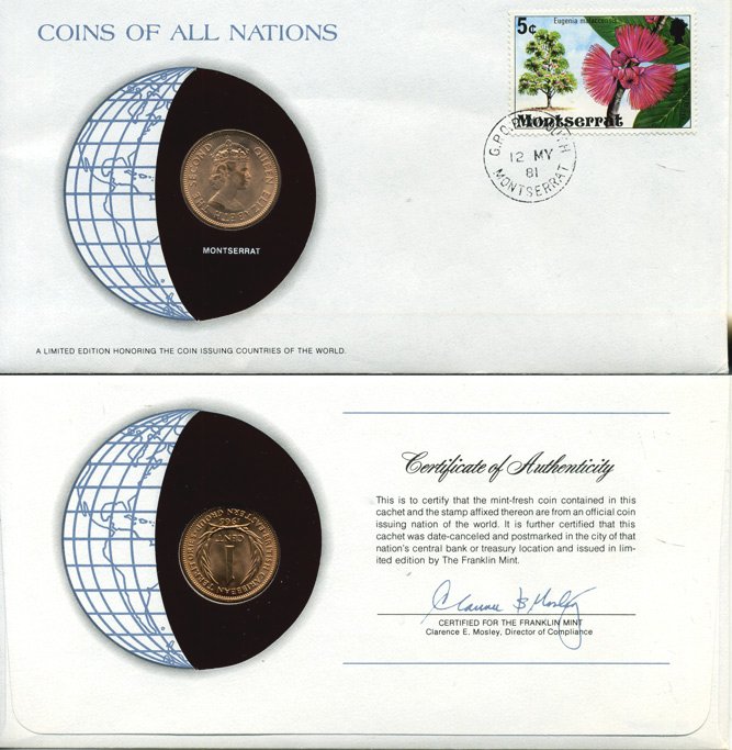 Восточно-Карибские штаты, Монтсеррат 1 цент 1965 конверт с маркой первого дня гашения, Coins of Nations KM 2 бронза UNC 4294-37-1