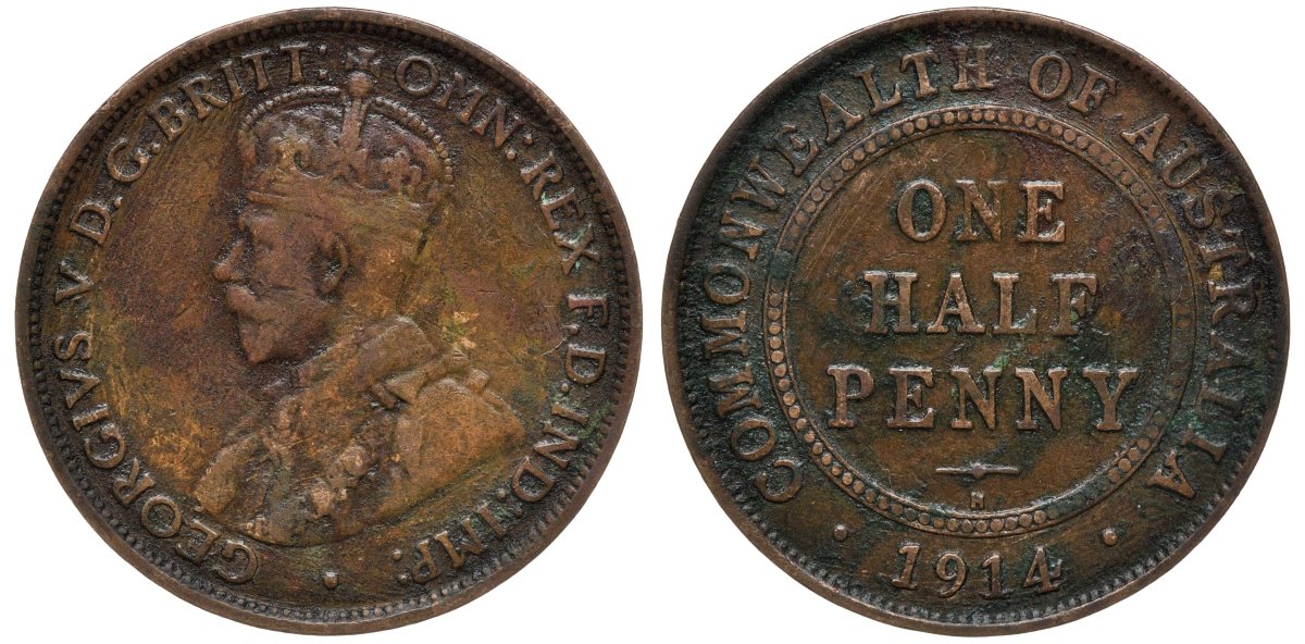 Австралия 1/2 пенни 1914 H, Георг V (1910-1936), монетный двор Хитон KM 22 бронза 60-224