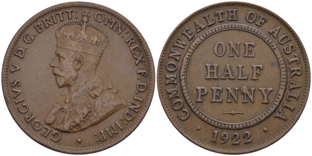 АВСТРАЛИЯ 1/2 ПЕННИ 1922 ГЕОРГ V KM 22 бронза 67-1217