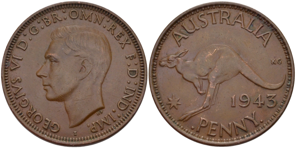 Австралия 1 пенни 1943 b, Георг VI (1936-1952), кенгуру, с буквой I KM 36 бронза 82-743