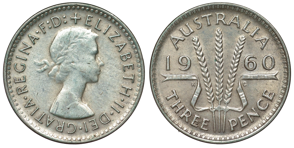 Австралия 3 пенса 1960 m, Елизавета II (1953-) KM 57 серебро 71-628