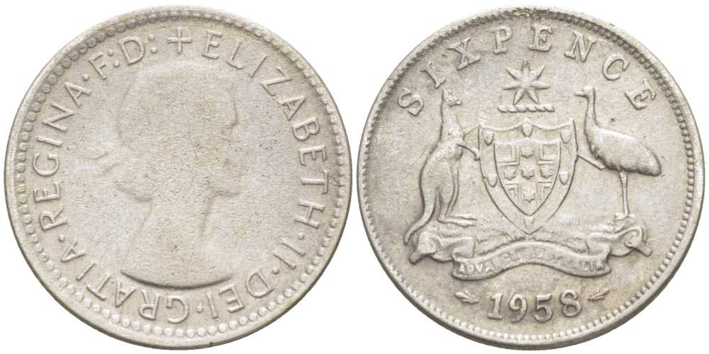 АВСТРАЛИЯ 6 ПЕНСОВ 1958 m, ЕЛИЗАВЕТА II (1953-), ГЕРБ АВСТРАЛИИ, ПРОБА 500, ДИАМЕТР 28,5 ММ. KM 58 серебро 4516-129