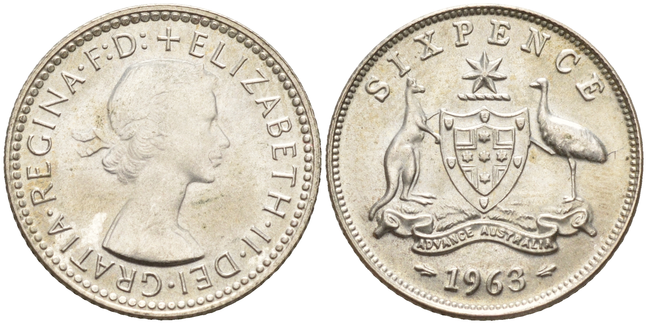 АВСТРАЛИЯ 6 ПЕНСОВ 1963 m, ЕЛИЗАВЕТА II (1953-), ГЕРБ АВСТРАЛИИ, ПРОБА 500, ДИАМЕТР 28,5 ММ. KM 58 серебро UNC 02-264-33