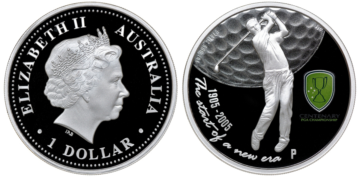 Австралия 1 доллар 2005 100 лет чемпионату мира по гольфу среди профессионалов (Professional Golfer's Association Championship), тираж 7500 экземпляров, в оригинальной коробке KM 831 серебро PROOF 8-1-05-09
