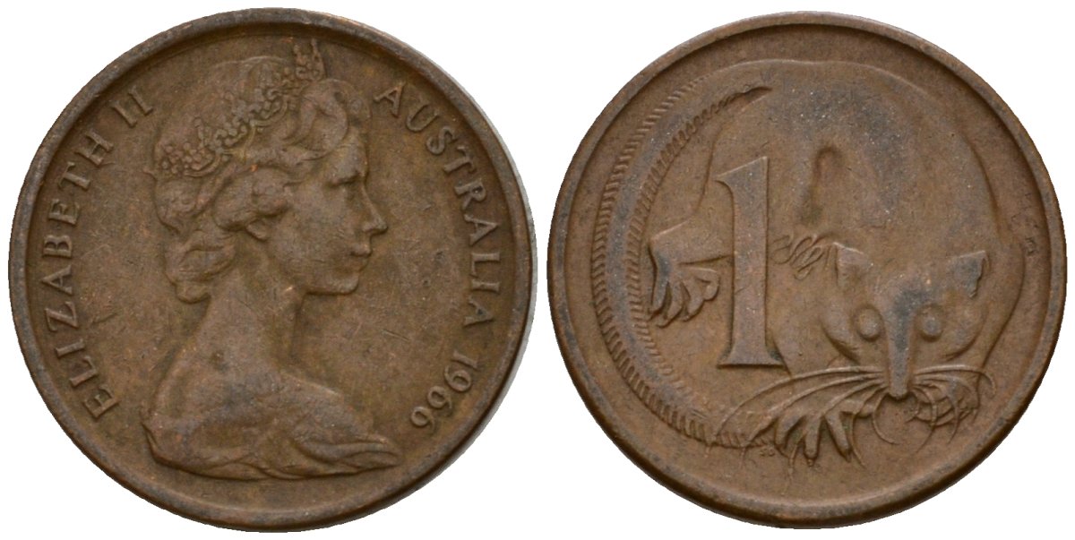 Австралия 1 цент 1966 Елизавета II (1953-), молодой портрет, опоссум KM 62 бронза 4602-212