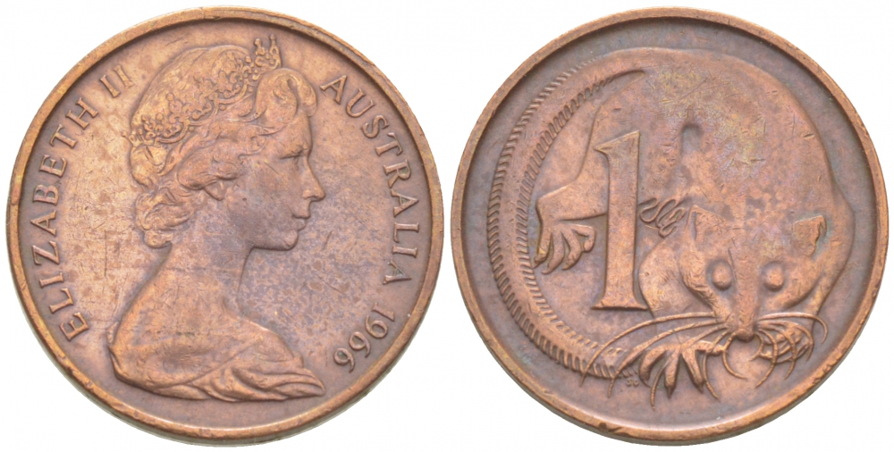 АВСТРАЛИЯ 1 ЦЕНТ 1966 ЕЛИЗАВЕТА II, МОЛОДОЙ ПОРТРЕТ, ОПОССУМ КМ 62 бронза 3955-448