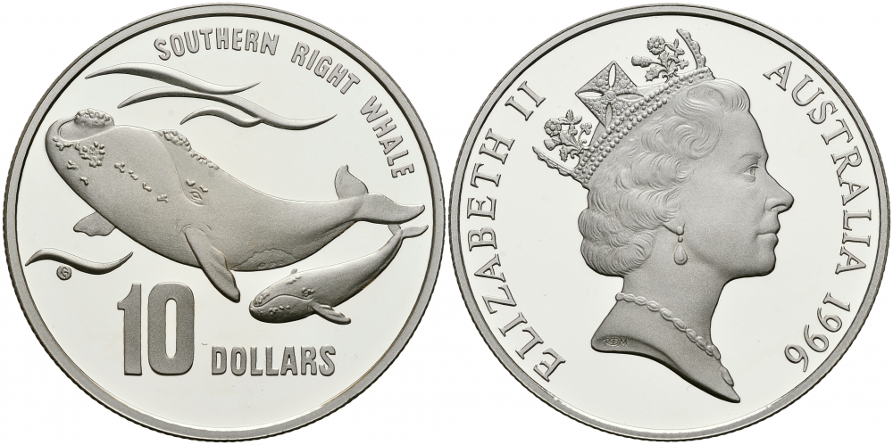 Австралия 10 долларов 1996 природа Австралии, южный гладкий кит, с китенком KM 314 серебро PROOF 1087-1-71