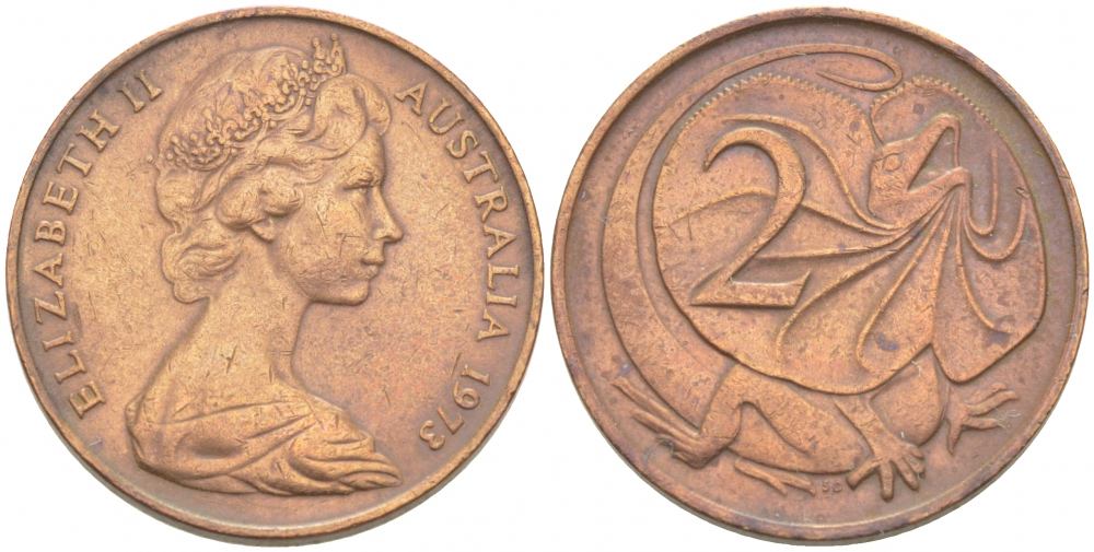 АВСТРАЛИЯ 2 ЦЕНТА 1973 ЕЛИЗАВЕТА II, МОЛОДОЙ ПОРТРЕТ, ПЛАЩЕНОСНАЯ ЯЩЕРИЦА (FRILLED LIZARD) KM 63 бронза 77-732