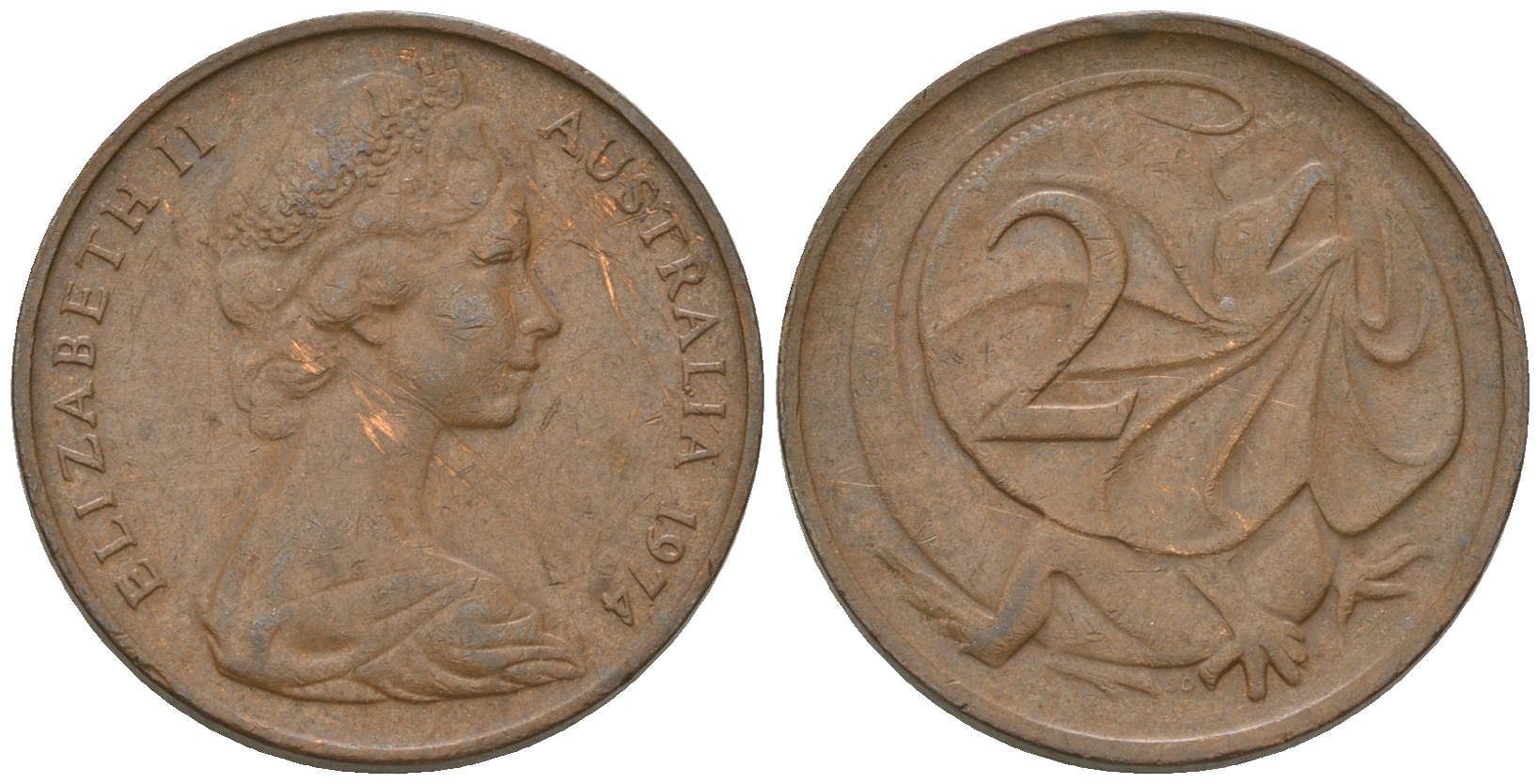Австралия 2 цента 1974 Елизавета II (1952-2022), плащеносная ящерица (FRILLED LIZARD) KM 63 бронза 4641-457