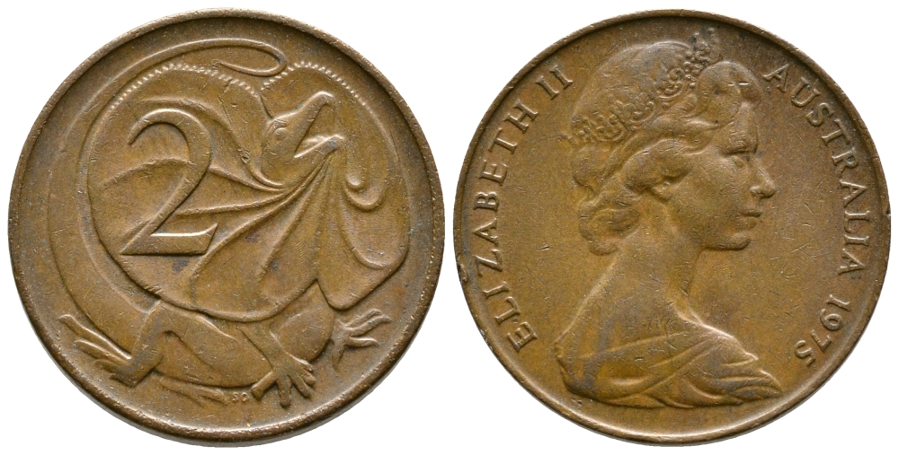 АВСТРАЛИЯ 2 ЦЕНТА 1975 ЕЛИЗАВЕТА II, МОЛОДОЙ ПОРТРЕТ, ПЛАЩЕНОСНАЯ ЯЩЕРИЦА (FRILLED LIZARD) KM 63 бронза 84-417