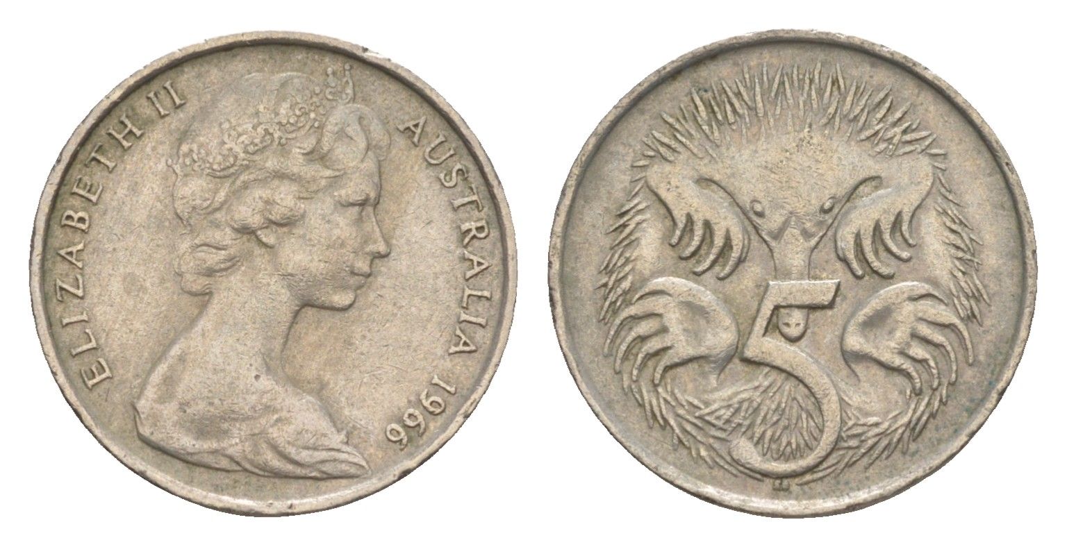 Австралия 5 центов 1966 Елизавета II (1952-2022) молодой портрет, ехидна KM 64 медно-никель 4151-314