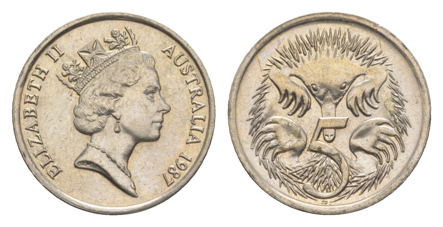 Австралия 5 центов 1987 Елизавета II (1952-2022), ехидна KM 80 медно-никель UNC 4152-1022