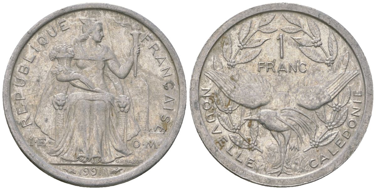 Французская Новая Каледония 1 франк 1991 птица кагу, (IEOM) KM 10, Schoen 10, Lec 51 алюминий 53-833