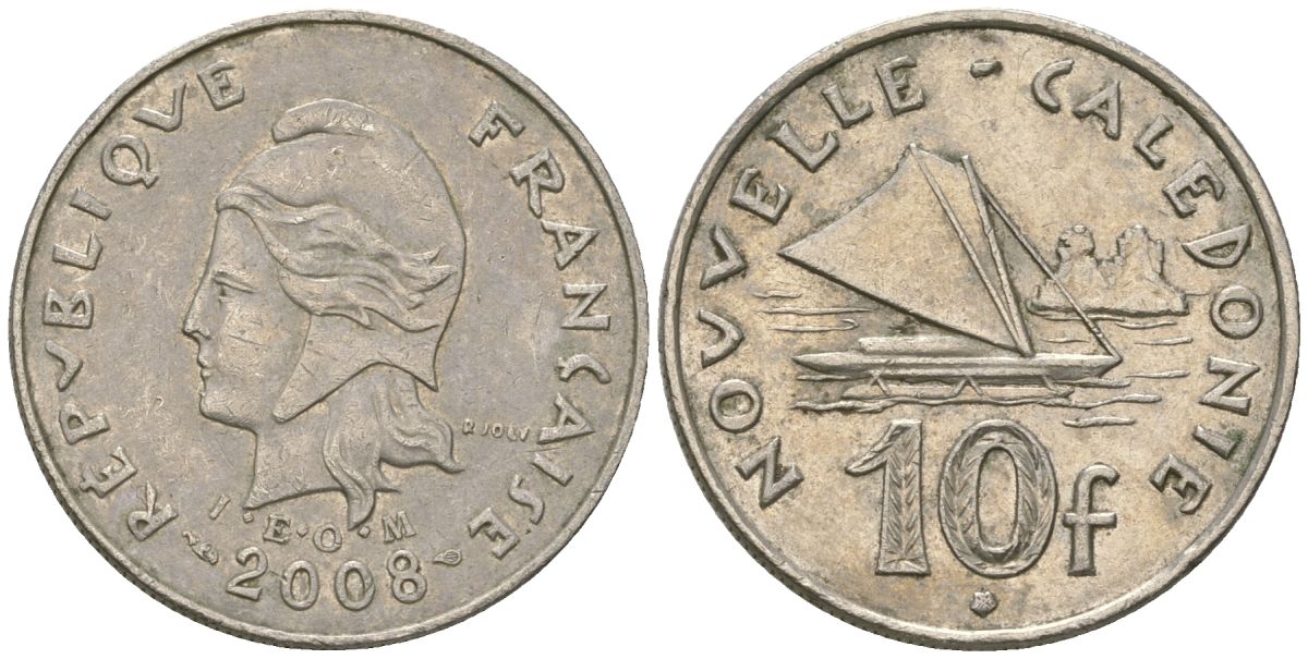 Французская Новая Каледония 10 франков 2008 рыбачья парусная лодка, (IEOM) KM 11a, Schoen 13a, Lec 99k медно-никель 60-332