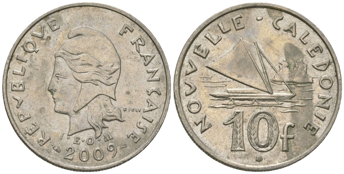 Французская Новая Каледония 10 франков 2009 рыбачья парусная лодка, (IEOM) KM 11a, Schoen 13a, Lec 99k медно-никель 60-1154