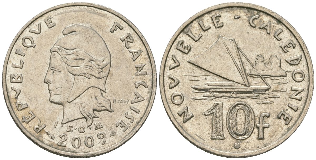 Французская Новая Каледония 10 франков 2009 рыбачья парусная лодка, (IEOM) KM 11a, Schoen 13a, Lec 99k медно-никель 60-1342