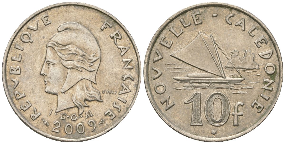 Французская Новая Каледония 10 франков 2009 рыбачья парусная лодка, (IEOM) KM 11a, Schoen 13a, Lec 99k медно-никель 61-1114