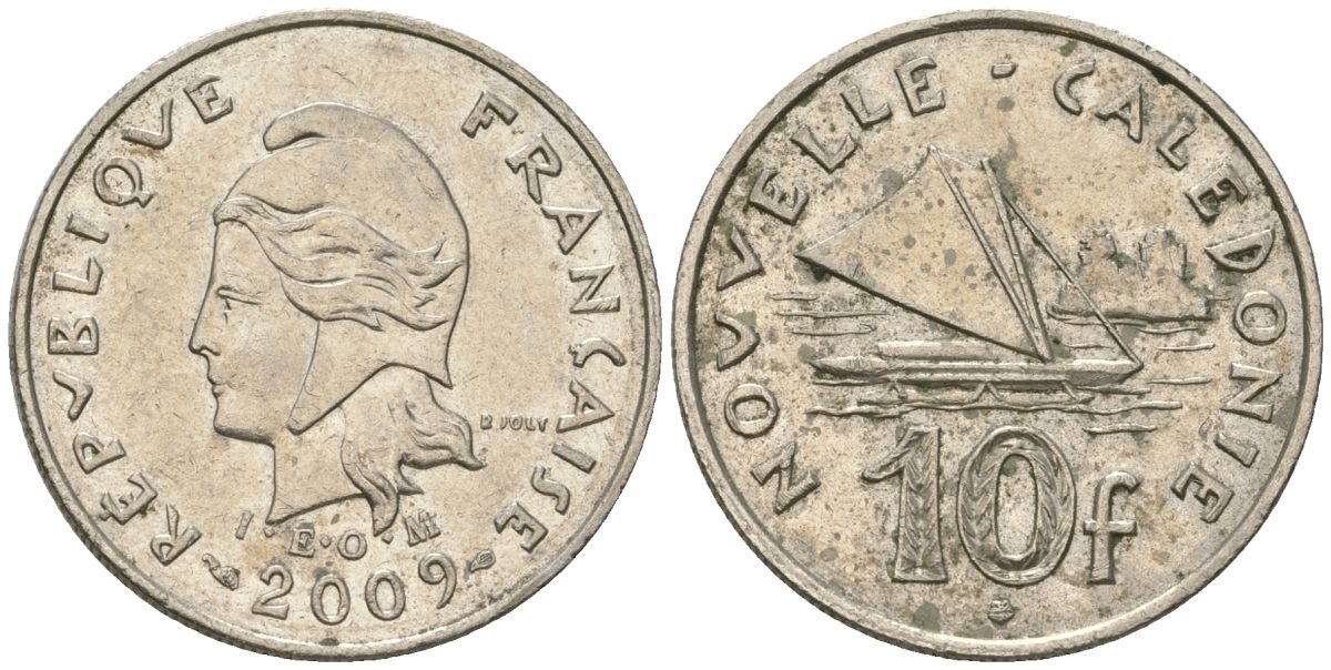 Французская Новая Каледония 10 франков 2009 рыбачья парусная лодка, (IEOM) KM 11a, Schoen 13a, Lec 99k медно-никель 62-355