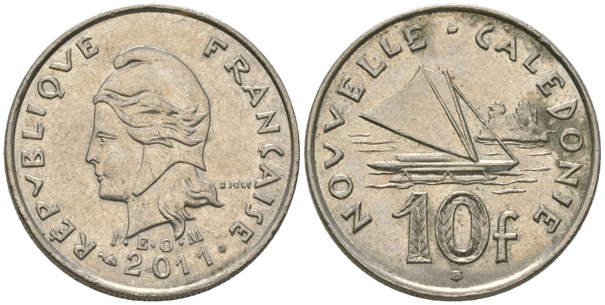 Французская Новая Каледония 10 франков 2011 рыбачья парусная лодка, (IEOM) KM 11a, Schoen 13a, Lec 99k медно-никель 65-125
