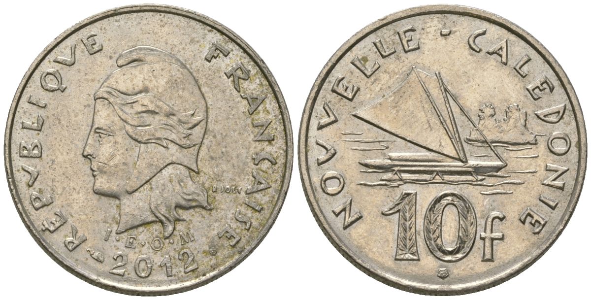 Французская Новая Каледония 10 франков 2012 рыбачья парусная лодка, (IEOM) KM 11a, Schoen 13a, Lec 99k медно-никель 65-532