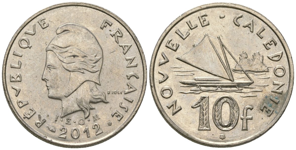 Французская Новая Каледония 10 франков 2012 рыбачья парусная лодка, (IEOM) KM 11a, Schoen 13a, Lec 99k медно-никель 65-833