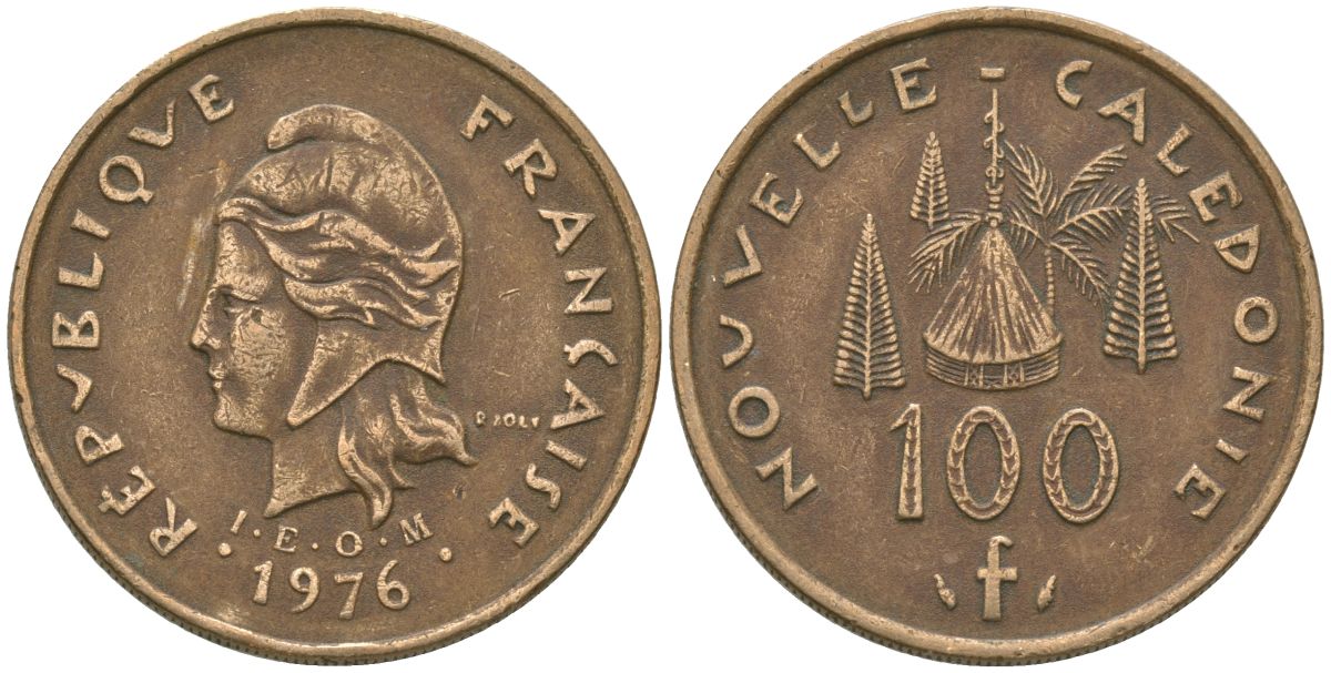 Французская Новая Каледония 100 франков 1976 хижина среди сосен и пальм, (IEOM) KM 15, Schoen 16, Lec 130 никель бронза 88-114