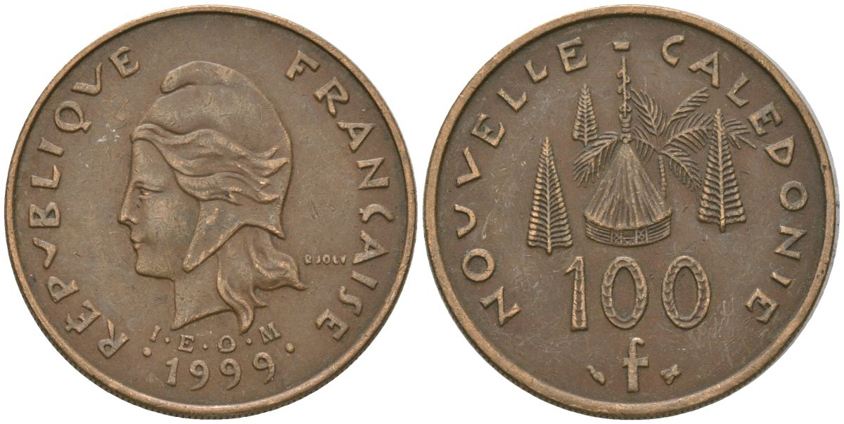 Французская Новая Каледония 100 франков 1999 хижина среди сосен и пальм, (IEOM) KM 15, Schoen 16, Lec 139c никель латунь 4140-1215
