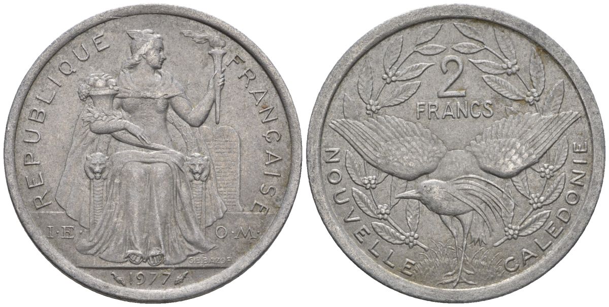 Французская Новая Каледония 2 франка 1977 птица кагу, (IEOM) KM 14, Schoen 11, Lec 58 алюминий 27-437