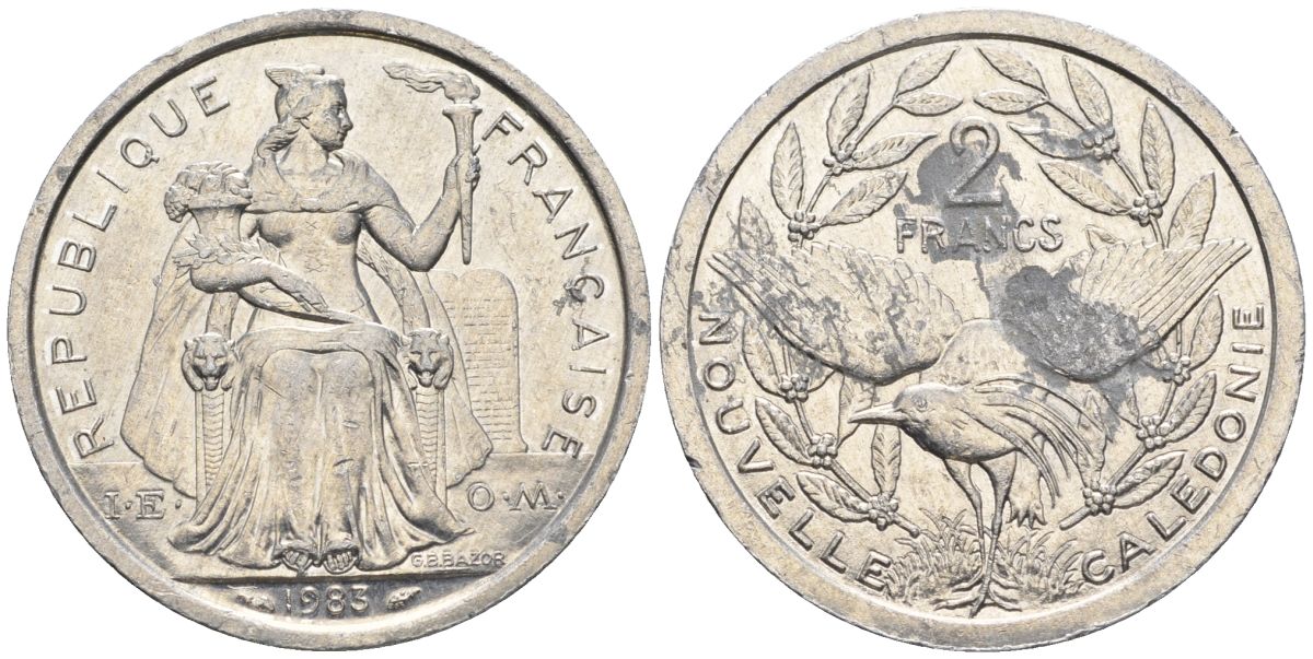 Французская Новая Каледония 2 франка 1983 птица кагу, (IEOM) KM 14, Schoen 11, Lec 63 алюминий 08-1121