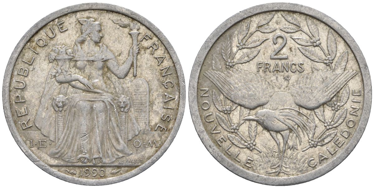 Французская Новая Каледония 2 франка 1990 птица кагу, (IEOM) KM 14, Schoen 11, Lec 66 алюминий 23-211