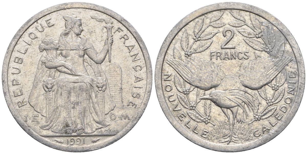 Французская Новая Каледония 2 франка 1991 птица кагу, (IEOM) KM 14, Schoen 11, Lec 67 алюминий 27-1245