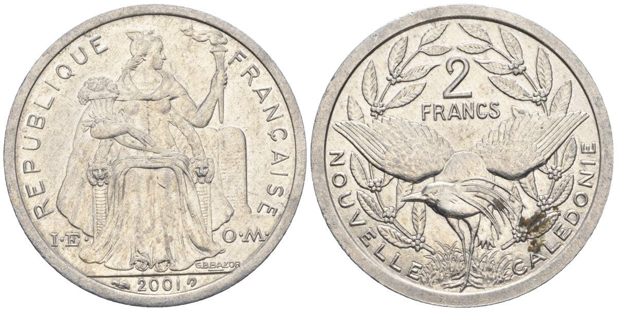 Французская Новая Каледония 2 франка 2001 птица кагу, (IEOM) KM 14, Schoen 11, Lec 68f алюминий 28-523