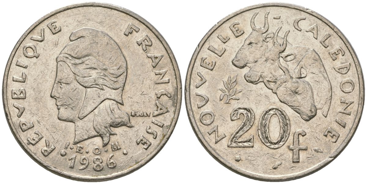 Французская Новая Каледония 20 франков 1986 три быка, (IEOM) KM 12, Schoen 14, Lec 112 никель 4123-446