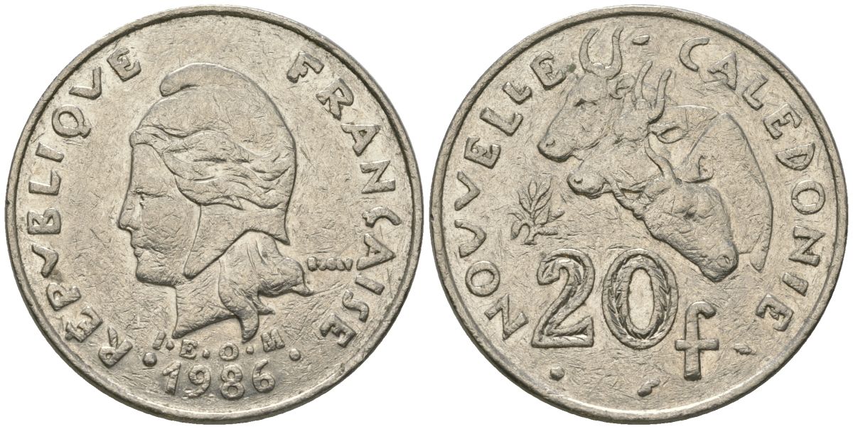 Французская Новая Каледония 20 франков 1986 три быка, (IEOM) KM 12, Schoen 14, Lec 112 никель 4680-934