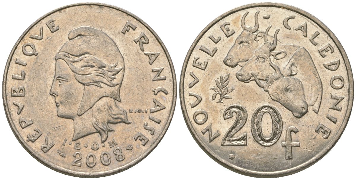 Французская Новая Каледония 20 франков 2008 три быка, (IEOM) KM 12a, Schoen 14a, Lec 115j медно-никель 81-1224