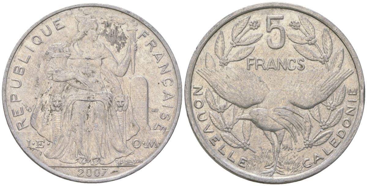 Французская Новая Каледония 5 франков 2007 птица кагу, (IEOM) KM 16, Schoen 12, Lec 81k алюминий 215-246