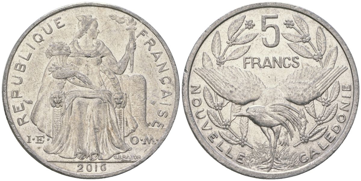 Французская Новая Каледония 5 франков 2016 птица кагу, (IEOM) KM 16, Schoen 12, Lec 81k алюминий 4117-1123