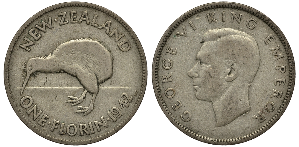 Новая Зеландия 1 флорин 1942 Георг VI (1936-1952), птичка киви KM 10.1 серебро 272-1531