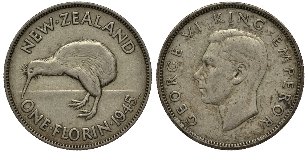 Новая Зеландия 1 флорин 1945 Георг VI (1936-1952), птичка киви KM 10.1 серебро 272-1622